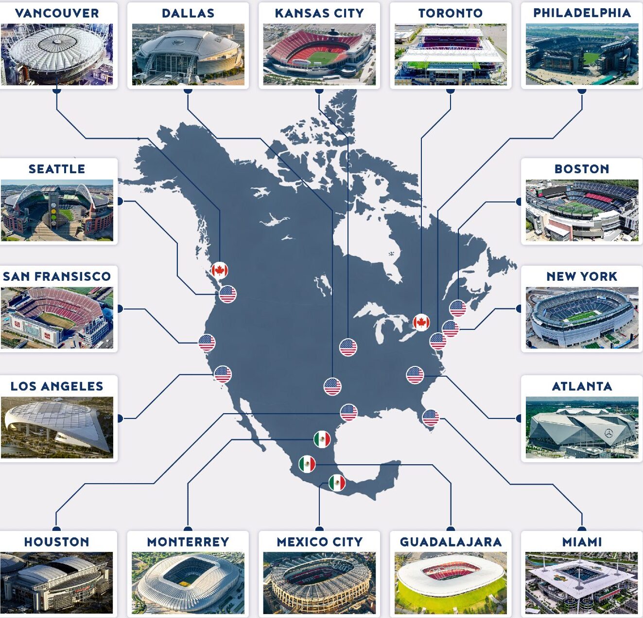 A pályázat beadásának idején hivatalosan 41 várost javasoltak, 43 létező és két építkezés alatt álló stadionnal (három stadion és három város Mexikóban, kilenc stadion és hét város Kanadában, illetve 38 stadion és 34 város az Egyesült Államokban). Az első fordulóban eltávolítottak kilenc stadiont kilenc városban, majd a másodikban kilenc helyszínt hat városban. Ezek mellett el kellett távolítani három várost (Chicago, Minneapolis és Vancouver), mert a FIFA nem volt hajlandó egyeztetni pénzügyi befektetésekről az adott helyszíneken. Így az első két forduló után 23 város és 24 stadion maradt. Miután Montréal 2021 júliusában visszalépett, Vancouver ismét jelölt lett 2022 áprilisában. Ezzel összesen 24 stadion maradt, mind külön városban vagy régióban. Ugyan vannak labdarúgásra kialakított stadionok Kanadában és az Egyesült Államokban is, a legnagyobb a Nashville-ben található Geodis Park, aminek befogadóképessége mindössze 30 ezer fő, ami 10 ezerrel kevesebb, mint a FIFA által előírt minimum (Toronto stadionja, ami egy harmincezres MLS-stadion, 45 ezer főre lesz bővítve a világbajnokságra). Ennek ellenére több stadiont is, mint a Mercedes-Benz Stadion (Atlanta) és a Lumen Field (Seattle) is használnak MLS és NFL csapatok is. Ugyan főleg amerikai futballra használják ezeket a stadionokat és a kanadai helyszínek a kanadai amerikai futball-ligának adnak otthon, mindet használták már labdarúgó-mérkőzésekre is. 2022. június 16-án a FIFA bejelentette a hivatalos házigazda-városokat, amiket három földrajzi régióra bontottak: Vancouver, Seattle, San Francisco, Los Angeles és Guadalajara a nyugati csoportban, Kansas City, Dallas, Houston, Atlanta, Monterrey és Mexikóváros a központi csoportban és Toronto, Boston, New York, Philadelphia és Miami a keleti csoportban (kettő Kanadában, három Mexikóban és tizenegy az Egyesült Államokban). Mexikóváros az egyetlen főváros, ahol tartanak mérkőzést, miután Ottawa és Washington nem kapott rendezési jogot. Washington jelölt volt, de egyesítette pályázatát Baltimore-ral a FedEx Field rossz állapotának következtében. Más városok, akik végül nem kaptak rendezési jogot: Cincinnati, Denver, Nashville, Orlando és Edmonton. Ottawa jelölt stadionja, a TD Place Stadion kiesett alacsony befogadóképessége miatt. Az 1994-es amerikai világbajnokságon használt stadionok egyike se helyszín 2026-ban, míg az Azteca az egyetlen, amit használtak az 1970-es és 1986-os mexikóin.