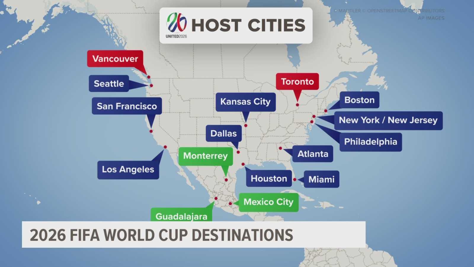 A pályázat beadásának idején hivatalosan 41 várost javasoltak, 43 létező és két építkezés alatt álló stadionnal (három stadion és három város Mexikóban, kilenc stadion és hét város Kanadában, illetve 38 stadion és 34 város az Egyesült Államokban). Az első fordulóban eltávolítottak kilenc stadiont kilenc városban, majd a másodikban kilenc helyszínt hat városban. Ezek mellett el kellett távolítani három várost (Chicago, Minneapolis és Vancouver), mert a FIFA nem volt hajlandó egyeztetni pénzügyi befektetésekről az adott helyszíneken. Így az első két forduló után 23 város és 24 stadion maradt. Miután Montréal 2021 júliusában visszalépett, Vancouver ismét jelölt lett 2022 áprilisában. Ezzel összesen 24 stadion maradt, mind külön városban vagy régióban. Ugyan vannak labdarúgásra kialakított stadionok Kanadában és az Egyesült Államokban is, a legnagyobb a Nashville-ben található Geodis Park, aminek befogadóképessége mindössze 30 ezer fő, ami 10 ezerrel kevesebb, mint a FIFA által előírt minimum (Toronto stadionja, ami egy harmincezres MLS-stadion, 45 ezer főre lesz bővítve a világbajnokságra). Ennek ellenére több stadiont is, mint a Mercedes-Benz Stadion (Atlanta) és a Lumen Field (Seattle) is használnak MLS és NFL csapatok is. Ugyan főleg amerikai futballra használják ezeket a stadionokat és a kanadai helyszínek a kanadai amerikai futball-ligának adnak otthon, mindet használták már labdarúgó-mérkőzésekre is. 2022. június 16-án a FIFA bejelentette a hivatalos házigazda-városokat, amiket három földrajzi régióra bontottak: Vancouver, Seattle, San Francisco, Los Angeles és Guadalajara a nyugati csoportban, Kansas City, Dallas, Houston, Atlanta, Monterrey és Mexikóváros a központi csoportban és Toronto, Boston, New York, Philadelphia és Miami a keleti csoportban (kettő Kanadában, három Mexikóban és tizenegy az Egyesült Államokban). Mexikóváros az egyetlen főváros, ahol tartanak mérkőzést, miután Ottawa és Washington nem kapott rendezési jogot. Washington jelölt volt, de egyesítette pályázatát Baltimore-ral a FedEx Field rossz állapotának következtében. Más városok, akik végül nem kaptak rendezési jogot: Cincinnati, Denver, Nashville, Orlando és Edmonton. Ottawa jelölt stadionja, a TD Place Stadion kiesett alacsony befogadóképessége miatt. Az 1994-es amerikai világbajnokságon használt stadionok egyike se helyszín 2026-ban, míg az Azteca az egyetlen, amit használtak az 1970-es és 1986-os mexikóin.
